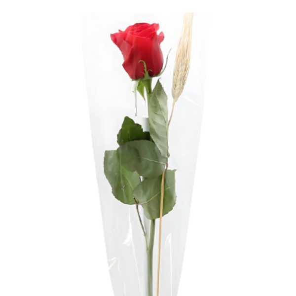 Tallo de rosa con espiga, presentado en bolsa decorativa. Una opción deal para completar tu oferta de Sant Jordi.